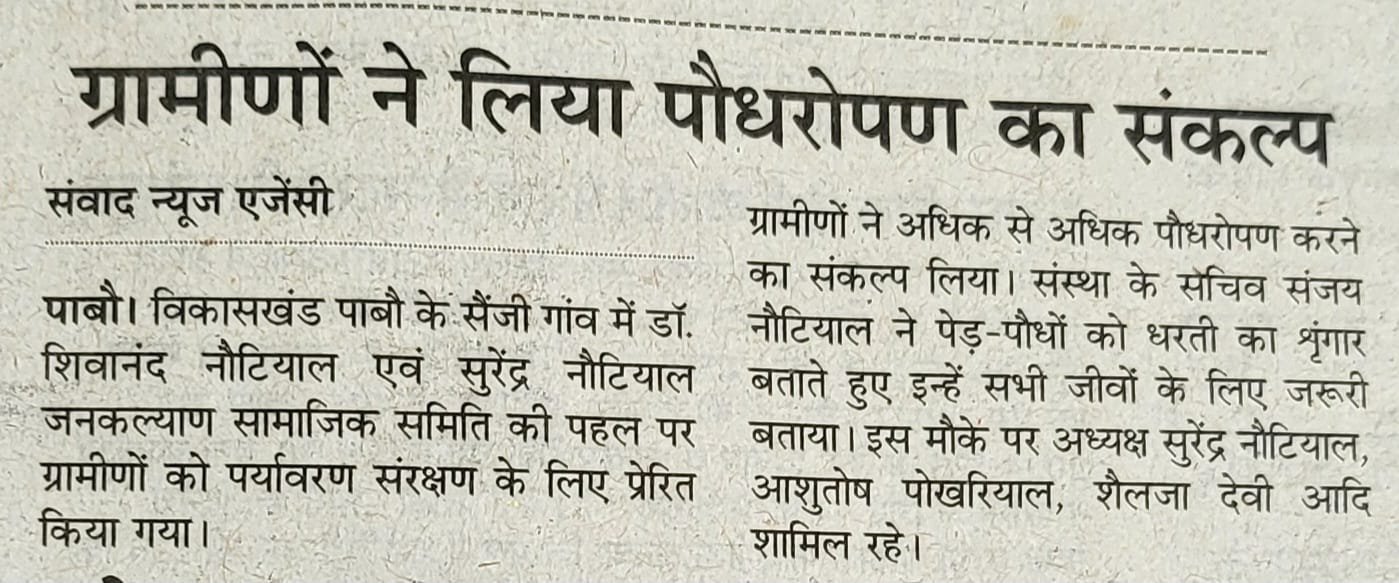 डॉ. शिवानंद नौटियाल एवं सुरेंद्र नौटियाल जनकल्याण सामाजिक समिति पाबौ की पहल पर सफाई एवं वृक्षारोपण कार्यक्रम संपन्न