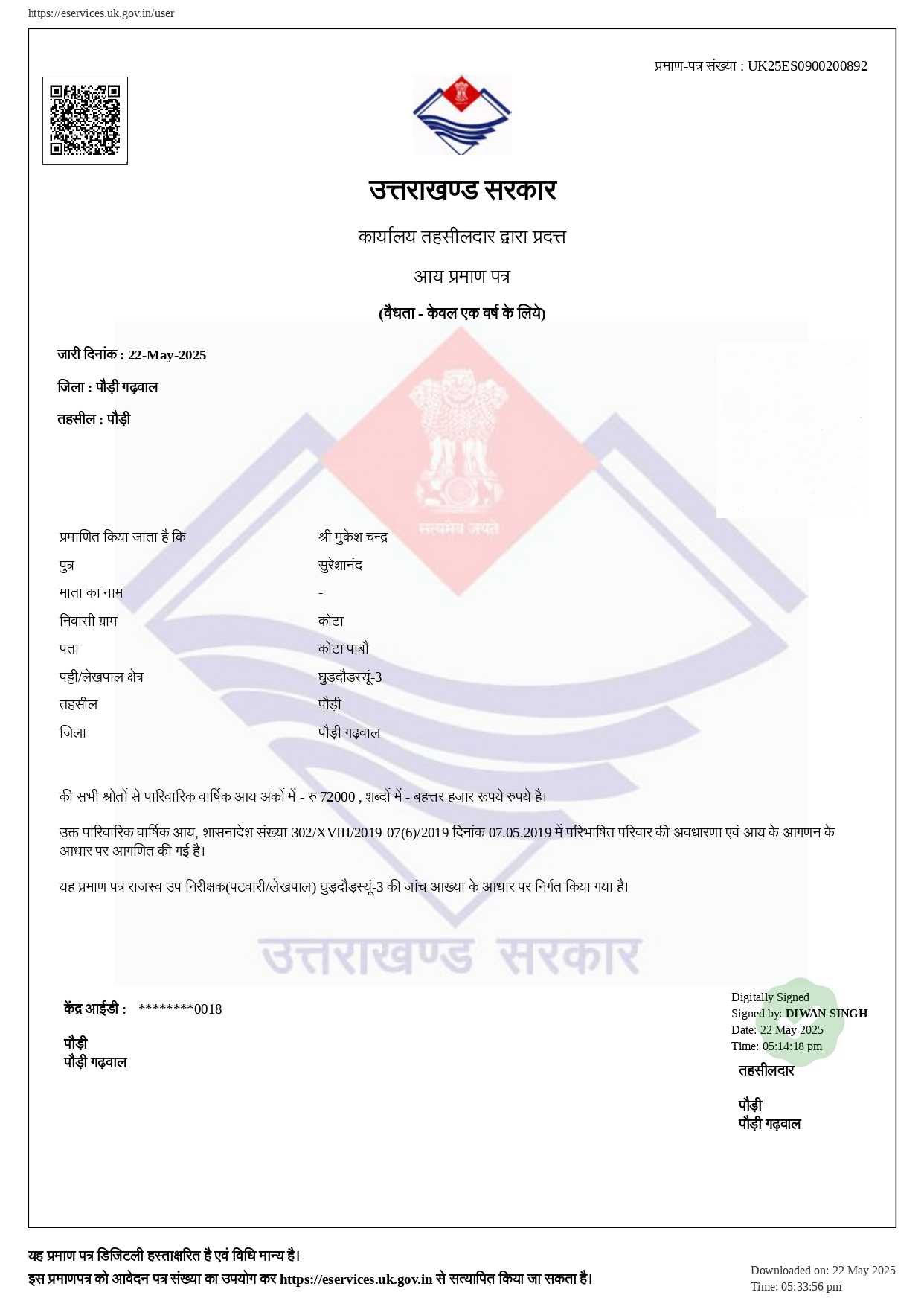 डॉ शिवानन्जद नौटियाल एंव सुरेन्द्र जनकल्याण सामाजिक समिति के प्रयास से विद्यार्थि को राहत – 4 घंटे में जारी हुआ आय प्रमाण पत्र